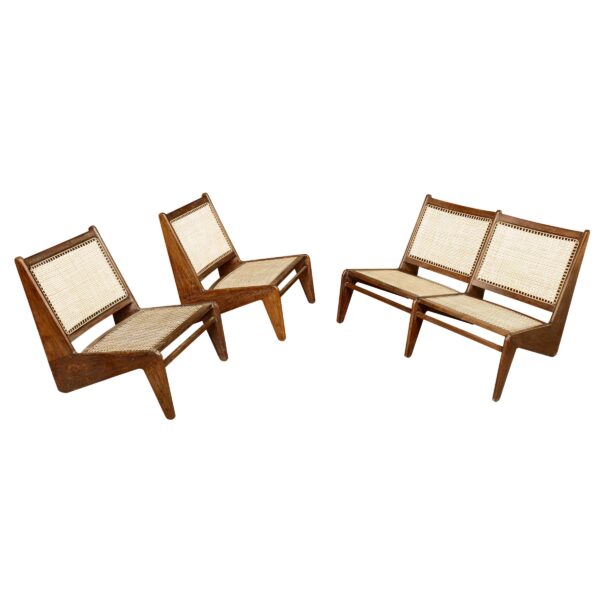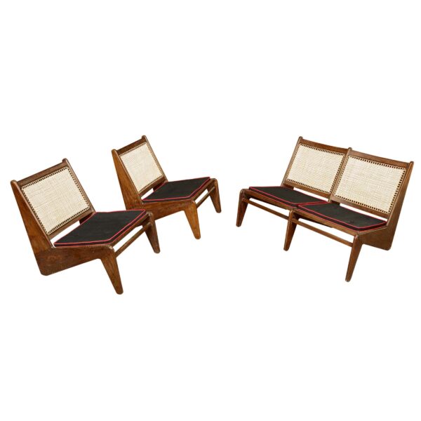 Canework seat and backrest on a profiled structure in teak forming a base at the back. Three slanted, profiled legs at the front. The slightly curved backrest, seat and leg follow on from each other to form a horizontal “Z” shape.