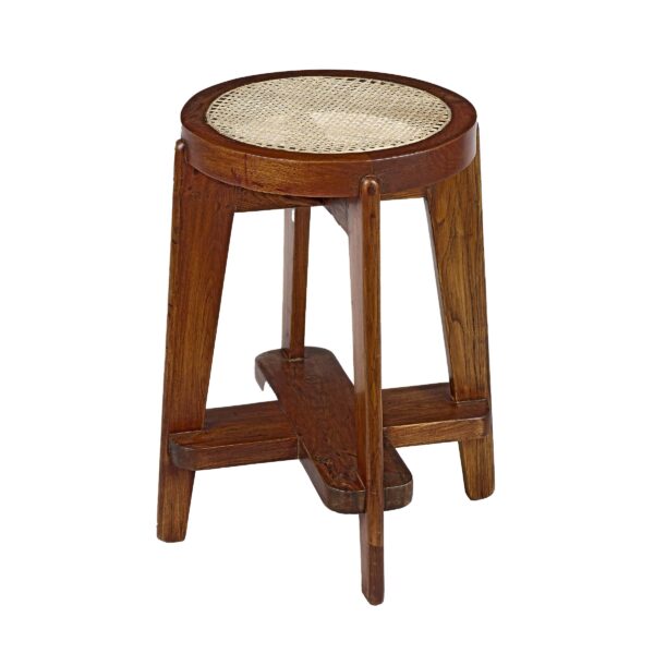High round stool in solid teak and braided canework. Circular seat with teak and canework frame.