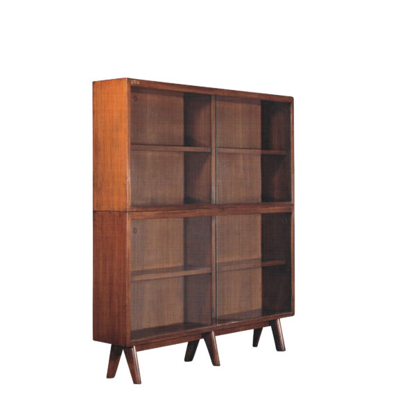 Glass-fronted unit known as “bookcase” in solid teak. Two juxtaposed quadrangular bodies, each one with two sliding glass doors. Thick teak shelving inside. Short base affixed underneath the body, made up of three “compass” type tapered, slanting leg pieces.